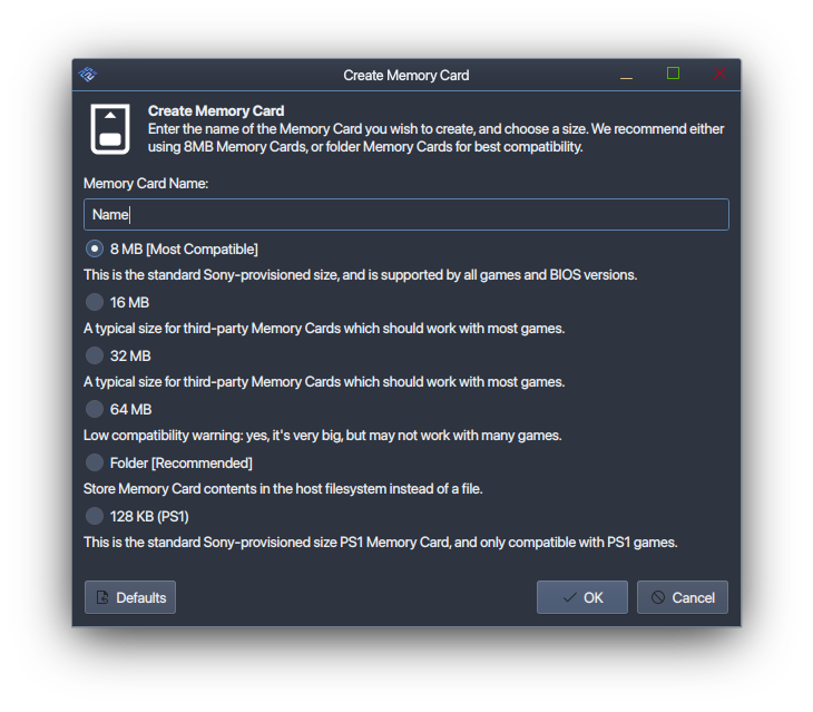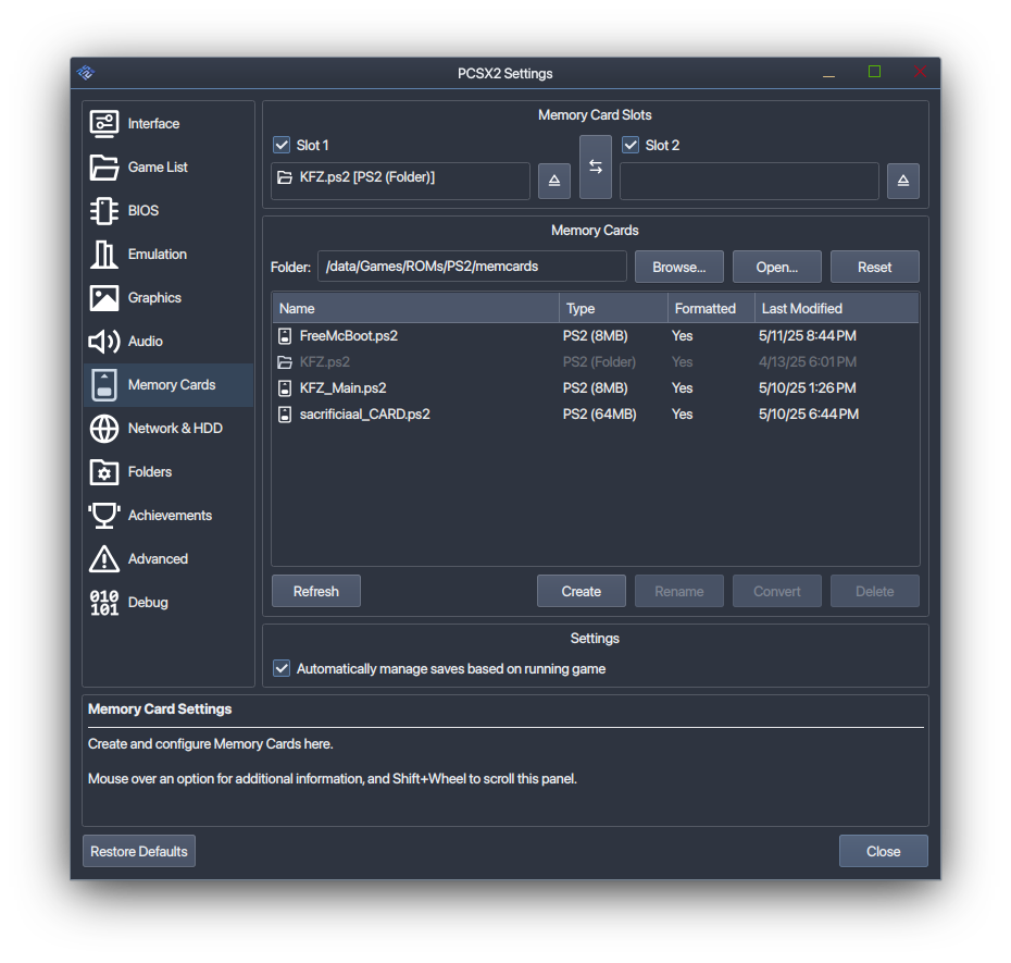 When you first install PCSX2, it comes with two virtual memory cards that you can use right away. You can also create a new one and even delete any of the existing ones.