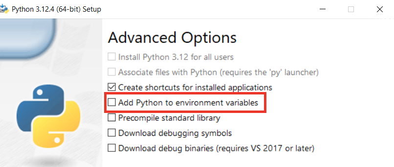 While going through the installer, make sure to check the box to add Python to your PATH. You may need to reboot your PC after installing to ensure your PATH variable is set properly; more on this later.