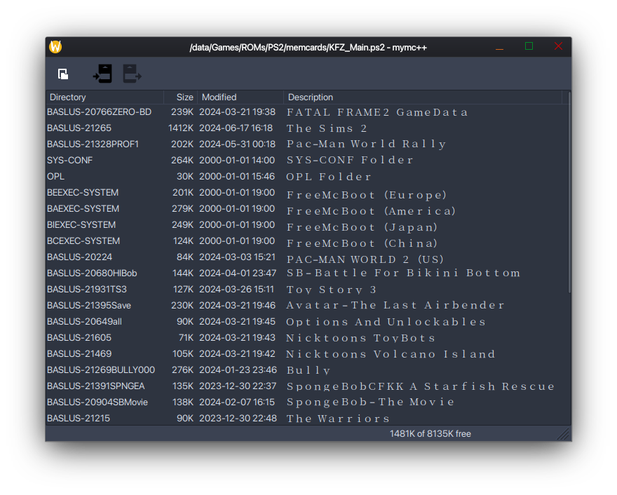 After opening, MyMC will populate a table with each game entry in your memory card. Some games which use multiple directory entries will show up as multiple rows; this is the same as how these games will show multiple files when viewed in your PS2 BIOS.